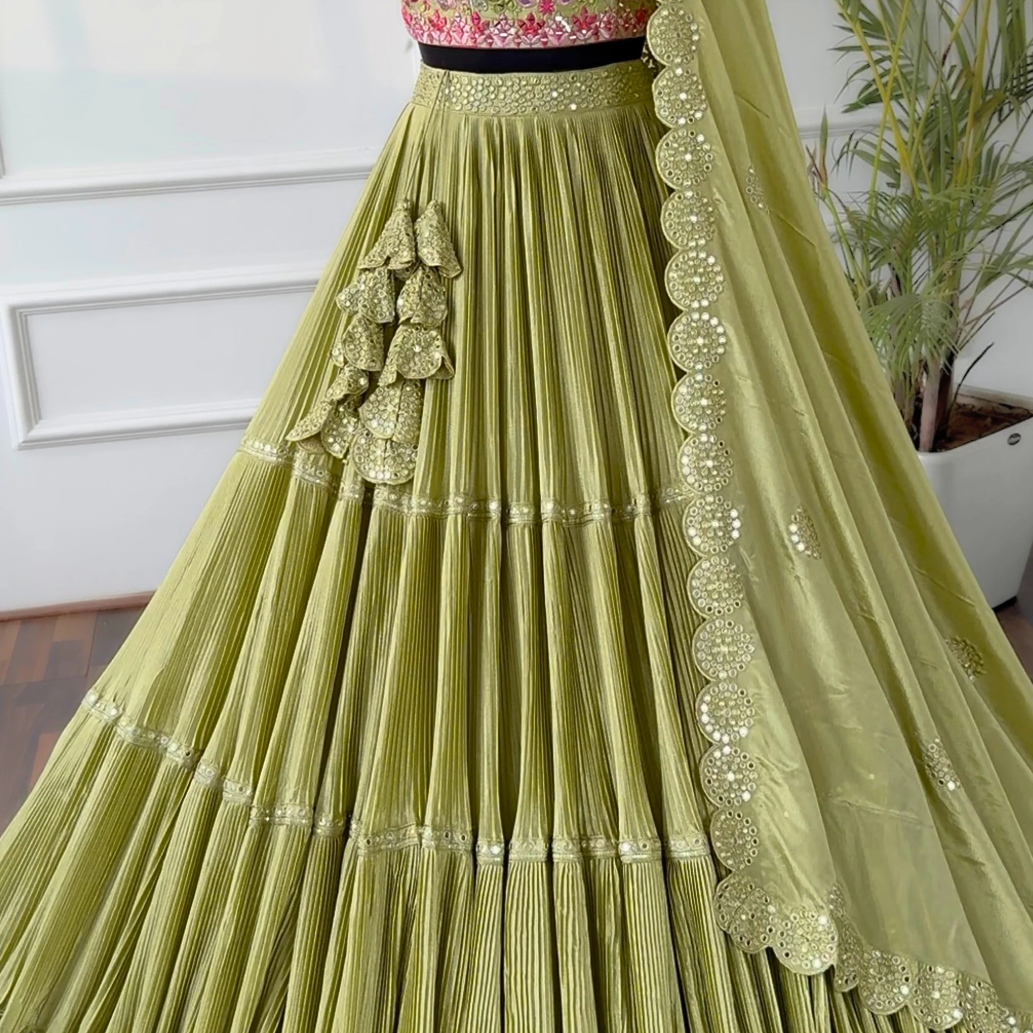 Pastal Green color Crush & Mirror Embroidery work Ruffle Style Lehenga Choli BL1546