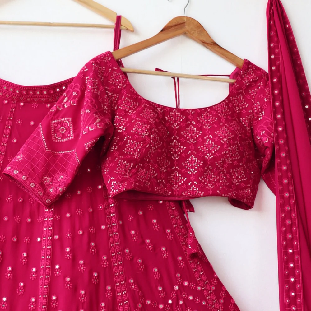 Lehenga : Faux Georgette With Mirror Embroidery Thread Work
